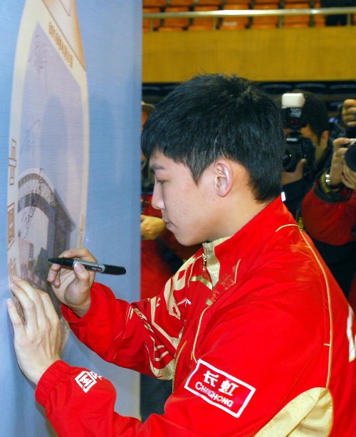 哈尔滨,2010年3月9日 (体育)(8)乒乓球——中国男队走进校园 3月9日,中国乒乓球男队队员陈玘在活动中签名。当日,中国乒乓球男队部分队员走进黑龙江大学,举行“直通莫斯科”中国乒乓球男队选拔赛(哈尔滨站)赛前新闻发布会,并与黑龙江当地的乒乓球爱好者联谊。 新华社记者王松摄