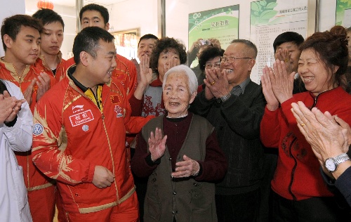 中国男队看望敬老院老人 老人们满心欢喜