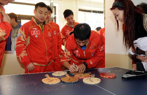 哈尔滨,2010年3月10日 (体育)(4)乒乓球——中国男队看望敬老院老人 3月10日,中国乒乓球队队员王励勤(右二)在球拍上签名。当日,中国乒乓球男队的部分教练员和队员来到哈尔滨市一家老年公寓,看望这里的老人,并与他们进行联谊。 新华社记者李勇摄