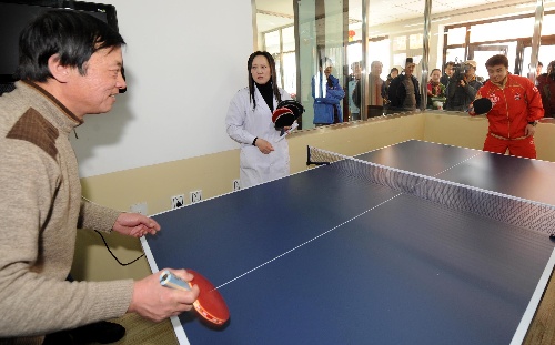 哈尔滨,2010年3月10日 (体育)(5)乒乓球——中国男队看望敬老院老人 3月10日,中国乒乓球队队员王皓(右)在与老人打乒乓球。当日,中国乒乓球男队的部分教练员和队员来到哈尔滨市一家老年公寓,看望这里的老人,并与他们进行联谊。 新华社记者李勇摄