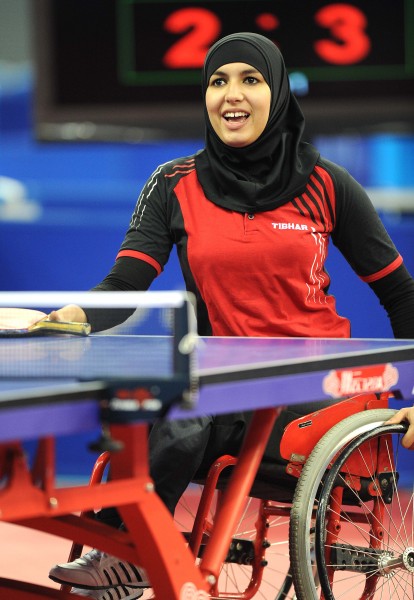 12月16日,约旦选手艾玛特在比赛中面带微笑。她参加的是女子单打TT4级B组的比赛,虽然她因实力悬殊以0比3输掉了比赛,但是美丽的笑容始终洋溢在她的脸上。
