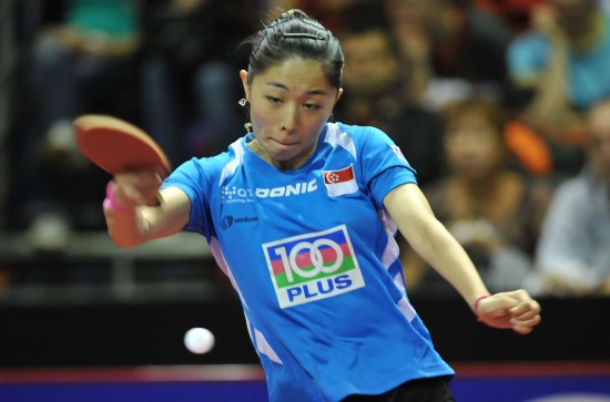 5月11日,新加坡选手于梦雨在比赛中回球。当日,在荷兰鹿特丹阿侯伊体育馆举行的2011年世界乒乓球(单项)锦标赛女子单打第二轮比赛中,新加坡选手于梦雨以4比2战胜卢森堡选手倪夏莲。