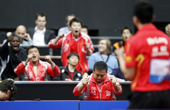 5月11日,中国男队主教练刘国梁(右二)等在马龙赢得关键局后激动不已。当日,在荷兰鹿特丹阿侯伊体育馆举行的2011年世界乒乓球(单项)锦标赛男子单打第二轮比赛中,马龙以4比2战胜斯洛文尼亚选手博扬-托基奇。