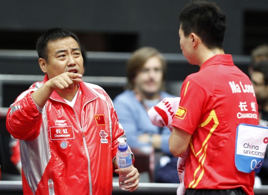 5月11日,中国男队主教练刘国梁在场边指导马龙。当日,在荷兰鹿特丹阿侯伊体育馆举行的2011年世界乒乓球(单项)锦标赛男子单打第二轮比赛中,马龙以4比2战胜斯洛文尼亚选手博扬-托基奇。