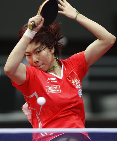 5月13日,中国选手李晓霞在比赛中回球。当日,在2011年世界乒乓球(单项)锦标赛女子单打四分之一决赛中,李晓霞以4比1战胜队友武杨,晋级四强。