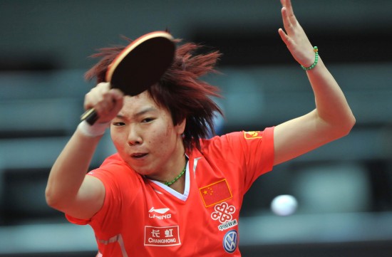 5月13日,中国运动员李晓霞在比赛中回球。当日,在荷兰鹿特丹举行的2011年世界乒乓球(单项)锦标赛女子单打半决赛中,中国运动员李晓霞以4比0战胜队友郭跃,晋级决赛。