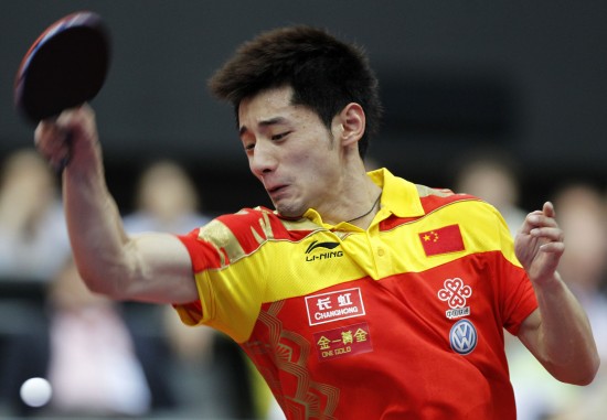 5月13日,中国选手张继科在比赛中。当日,在荷兰鹿特丹阿侯伊体育馆举行的2011年世界乒乓球(单项)锦标赛男子单打十六强比赛中,张继科以4比0战胜韩国选手朱世爀,晋级八强。