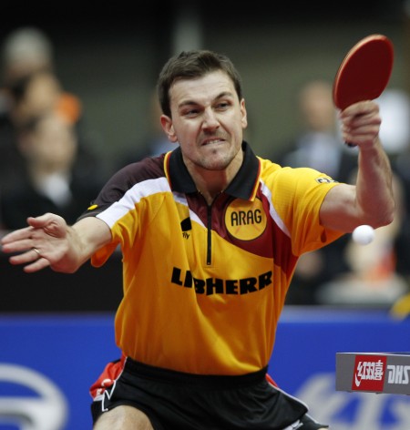 5月13日,德国选手波尔在比赛中。当日,在荷兰鹿特丹阿侯伊体育馆举行的2011年世界乒乓球(单项)锦标赛男子单打第四轮比赛中,波尔以4比2战胜队友奥恰洛夫,晋级八强。