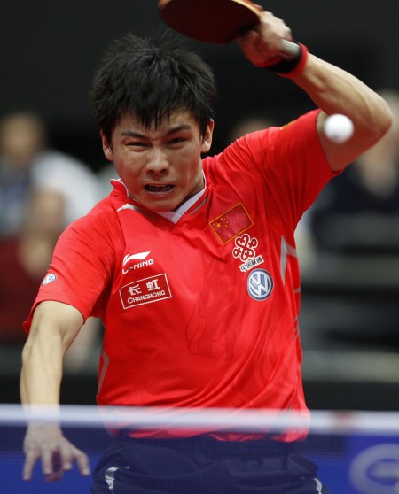 5月13日,中国选手陈玘在比赛中。当日,在荷兰鹿特丹阿侯伊体育馆举行的2011年世界乒乓球(单项)锦标赛男子单打第四轮比赛中,陈玘以4比3战胜白俄罗斯选手萨姆索诺夫,晋级八强。