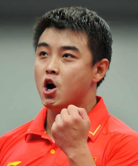 5月14日,中国选手王皓在比赛中庆祝得分。当日,在2011年世界乒乓球(单项)锦标赛男子单打四分之一决赛中,中国选手王皓以4比0战胜日本选手水谷隼,晋级四强。