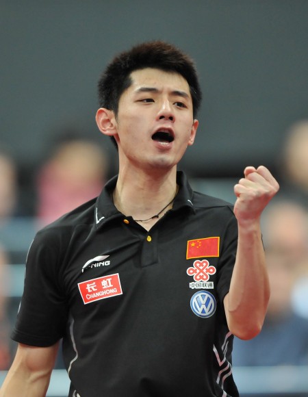 5月14日,中国选手张继科在比赛中庆祝得分。当日,在2011年世界乒乓球(单项)锦标赛男子单打四分之一决赛中,中国选手张继科以4比2战胜队友王励勤,晋级四强。