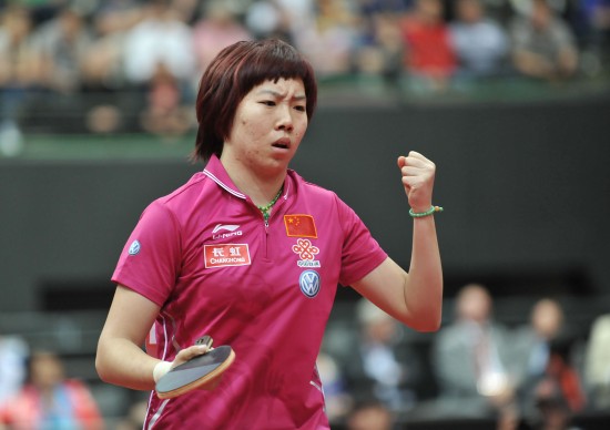 5月14日,李晓霞在比赛中庆祝得分。当日,在2011年世界乒乓球(单项)锦标赛女子单打决赛中,中国选手李晓霞对阵队友丁宁。