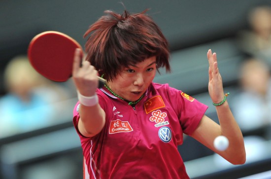 5月14日,李晓霞在比赛中回球。当日,在2011年世界乒乓球(单项)锦标赛女子单打决赛中,中国选手李晓霞对阵队友丁宁。