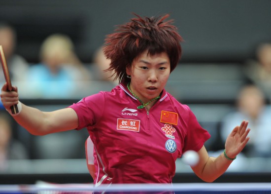 5月14日,李晓霞在比赛中回球。当日,在2011年世界乒乓球(单项)锦标赛女子单打决赛中,中国选手李晓霞对阵队友丁宁。