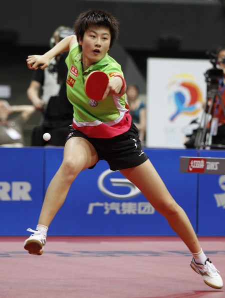 5月14日,中国选手丁宁在比赛中。当日,在2011年世界乒乓球(单项)锦标赛女子单打决赛中,丁宁以4比2战胜队友李晓霞,获得冠军。