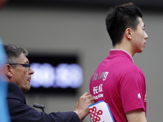 5月15日,裁判在帮助马龙把掉下的号码布用别针别上。因为双方是同队球员比赛,没有教练在场边,戴号码布的事情就由热心的裁判代劳。当日,在荷兰鹿特丹阿侯伊体育馆举行的2011年世界乒乓球(单项)锦标赛男子单打半决赛中,马龙以2比4不敌队友王皓,获得铜牌。