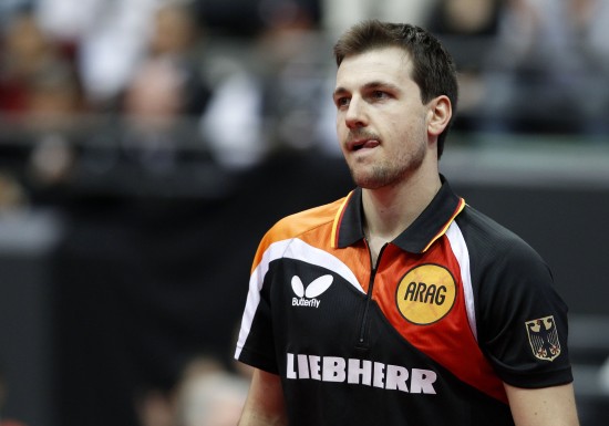 5月15日,德国选手波尔在比赛中。当日,在荷兰鹿特丹阿侯伊体育馆举行的2011年世界乒乓球(单项)锦标赛男子单打半决赛中,波尔以1比4不敌中国选手张继科,获得铜牌。