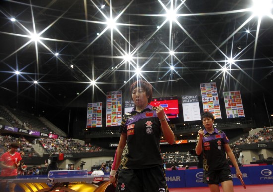 5月15日,中国选手郭跃(右)/李晓霞在比赛中。当日,在荷兰鹿特丹阿侯伊体育馆举行的2011年世界乒乓球(单项)锦标赛女子双打决赛中,中国选手郭跃/李晓霞以4比0战胜队友丁宁/郭焱,夺得冠军。