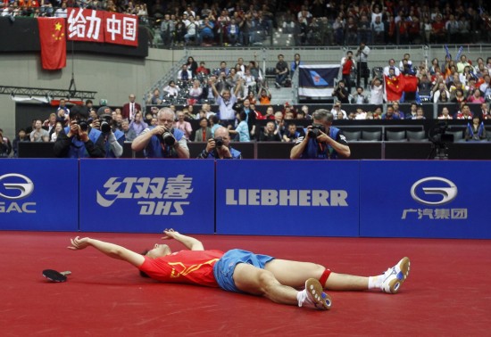 5月15日,中国选手张继科获胜后倒地庆祝。当日,在荷兰鹿特丹阿侯伊体育馆举行的2011年世界乒乓球(单项)锦标赛男子单打决赛中,张继科以4比2战胜队友王皓,夺得冠军。