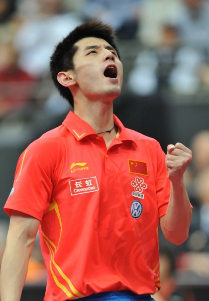 5月15日,中国选手张继科在比赛中庆祝得分。当日,在荷兰鹿特丹阿侯伊体育馆举行的2011年世界乒乓球(单项)锦标赛男子单打决赛中,张继科以4比2战胜队友王皓,夺得冠军。