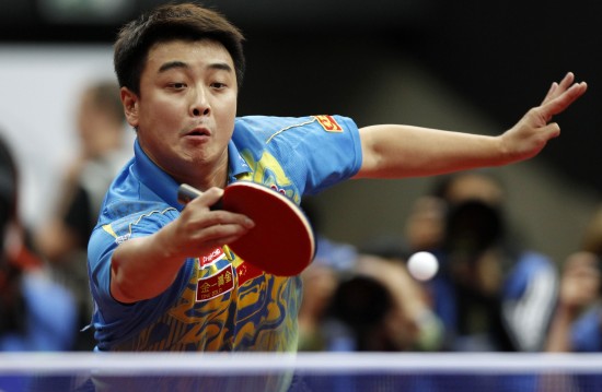 5月15日,中国选手王皓在比赛中。当日,在荷兰鹿特丹阿侯伊体育馆举行的2011年世界乒乓球(单项)锦标赛男子单打决赛中,王皓以2比4不敌队友张继科,获得亚军。