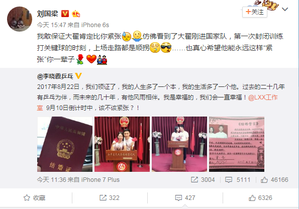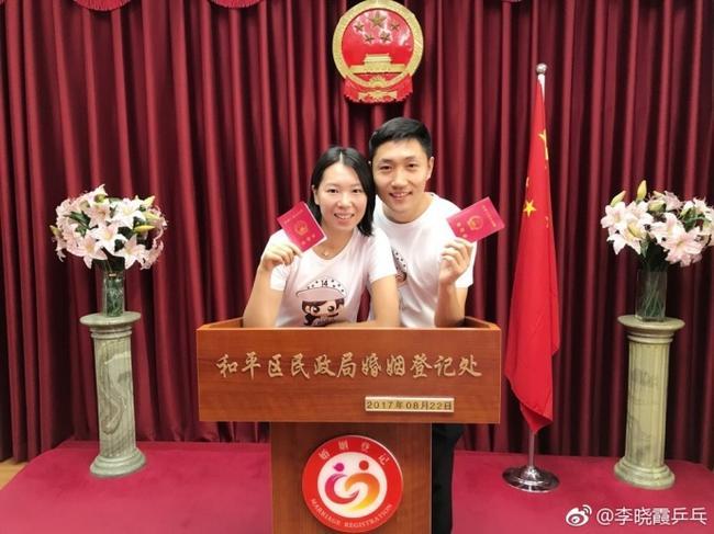 李晓霞在微博中这样写道:“2017年8月22日,我们领证了,我的人生多了一个本,我的生活多了一个他。过去的二十几年有乒乓为伴,而未来的几十年,有他风雨相伴。我是幸福的,我们会一直幸福!@LXX工作室 9月10日倒计时中,该不该紧张?! ”