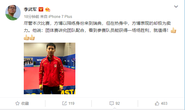 现年26岁的方博早在2015年就夺得过世界杯团体赛冠军,这次作为陪练随队来到瑞典,李武军介绍,“尽管本次比赛,方博以陪练身份来到瑞典,但在热身中,方博表现的却极为卖力。他说,‘团体赛讲究团队配合,看到参赛队员能获得一场场胜利,就值得!’”