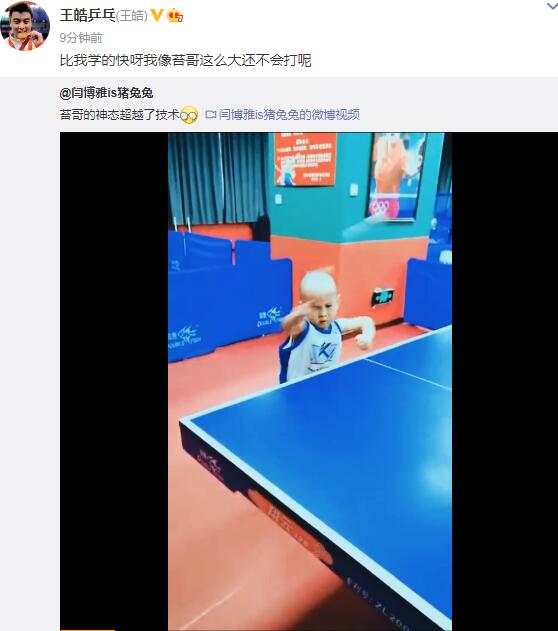 都说虎父无犬子,乒乓球名将、国乒教练王皓的大儿子小海苔运动天赋过人。近日,王皓娇妻闫博雅又晒出一段爱子小海苔打乒乓球的视频,小家伙“萌凶萌凶”的样子可爱到犯规。