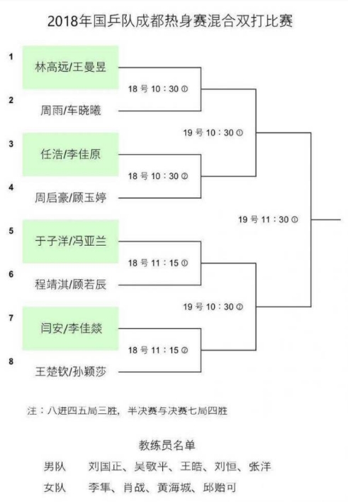 林高远/王曼昱VS周雨/车晓曦,18号10:30,在1号球桌任浩/李佳原VS周启豪/顾玉婷,18号10:30,在2号球桌