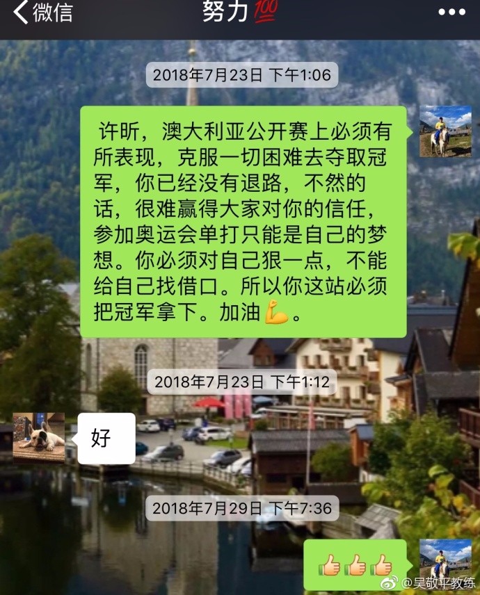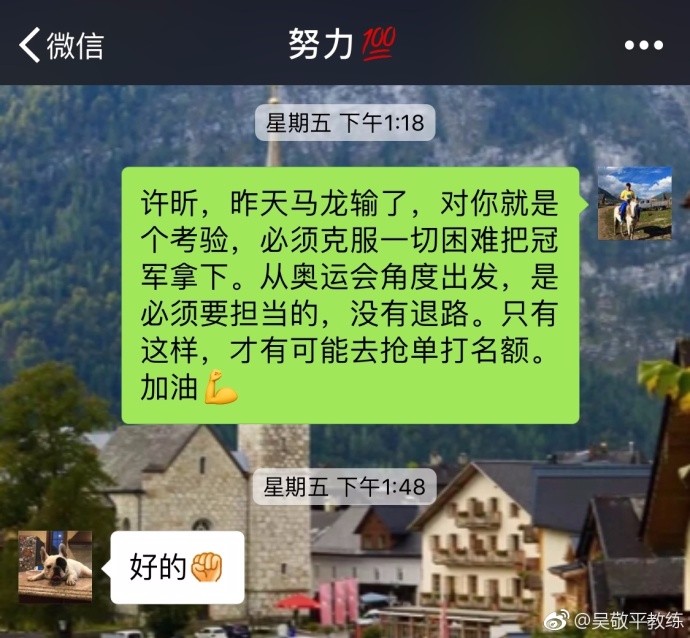 上周五,吴敬平又和许昕说:“许昕,昨天马龙输了,对你就是个考验,必须克服一切困难把冠军拿下。从奥运会角度出发,是必须要担当的,没有退路。只有这样,才有可能去抢单打名额。加油”许昕这次回复“好的”。