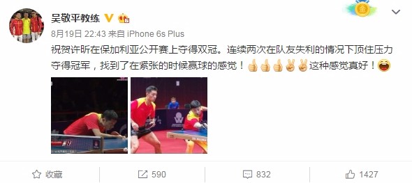 昨天许昕夺冠后我发了一篇微博鼓励他。时间已很晚就没再关注,结果今天早上起来发现很多评论,各种难听的话都有。这是你们不了解教练员工作的方法的缘故。对于许昕来说,2020年奥运会是许昕夺取奥运会单打冠军的最后机会。奥运会比赛是非常残酷的,队内竞争也非常残酷。由于奥运会只有两个人参赛,最好的结局就是两人在决赛中相遇,如果有一人失利,另外一个人就必须克服一切困难拿下冠军。这对运动员的心理承受力和技战术能力要求非常高。由于许昕在前两站比赛打得不好,所以在澳大利亚公开赛前对许昕提出了必须夺冠的要求,没有退路。结果许昕很好地完成了任务。保加利亚公开赛前没有给许昕提要求,但在马龙输球后我抓住这个机会,给许昕提出了在队友失利后必须拿下冠军,把比赛当做是奥运会的预演,给他施加了压力。况且东京奥运会的主要对手日本队是放弃了亚运会,倾巢出动。因此许昕必须有所担当,锤炼自己的心理承受力,给日本队予以痛击,拿下冠军。结果许昕做到非常好,表现出了非常强烈的赢球渴望,在紧张的情况下赢得了胜利,这种感觉就是奥运会比赛时的感觉。我之所以鼓励许昕,并不是看重拿了冠军,公开赛冠军对中国队来说没有什么意义,我更注重的是许昕在两次比赛所表现出来的抗压能力和对胜利的渴望,这对许昕来讲是非常可贵的,也是想竞争奥运会单打资格必须具备的素质。所以请大家不要对昨天的微博过度解读,多从积极的角度去理解。