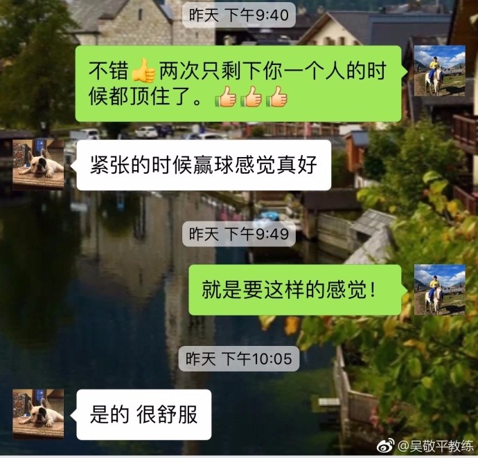 昨晚,吴敬平和许昕接着聊,吴敬平说“不错,两次只剩下你一个人的时候都顶住了。”许昕回复“紧张的时候赢球感觉真好”。吴敬平说:“就是要这样的感觉”。许昕回“是的,很舒服”