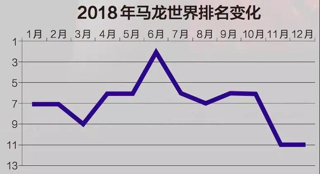 马龙在2018年1月份失去了已经连续占据34个月的世界排名第一宝座,德国人奥恰洛夫一跃登顶,打破了中国选手长达7年的垄断。之后,因年龄和伤病原因选择性出战公开赛的马龙始终没能夺回“王权”,6月份中国公开赛拿到男单冠军后排名第二,成为了他在2018赛季离王座最近的一次。事实上,马龙在2018赛季虽然参赛较少,但是四次参赛两夺冠军的成绩足够出色,只是因为参赛站次不够,最终在年末跌出了前10。