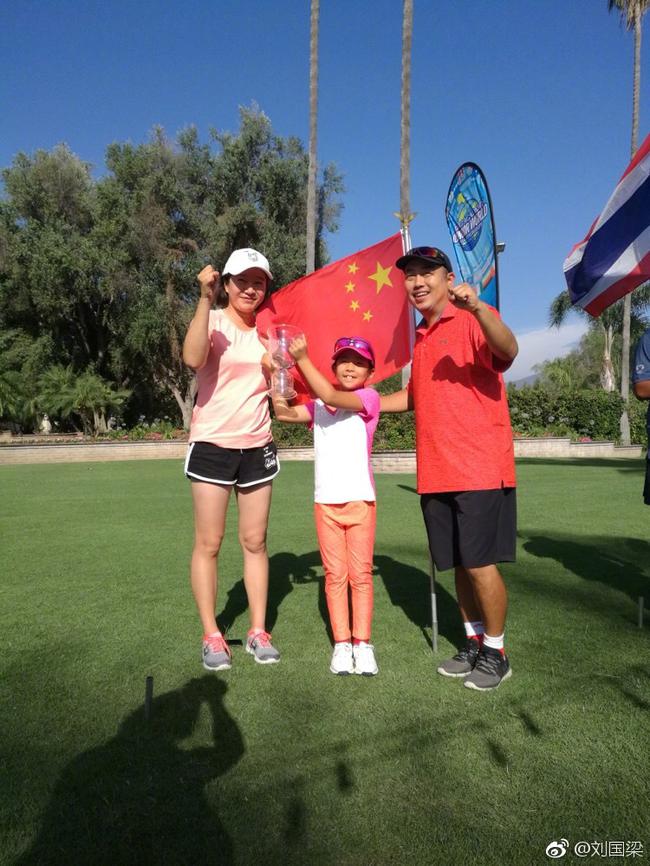 刘国梁夫妇陪孩子练习高尔夫
