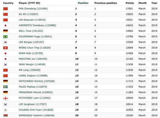 乒联最新排名丁宁樊振东领跑 巴西新星跻身前10