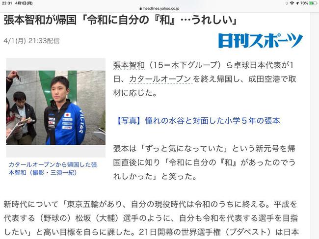 新年号也意味着日本进入一个新时代,张本表示要在本月开幕的世乒赛夺得金牌,报答即将过去的日本平成年代(1989年1月-2019年4月)对自己的培育之恩:“新的令和年代,有2020年东京奥运会,我自己的乒球运动生涯也会在这个年代结束。我要向代表着平成年代的(棒球明星)松坂大辅选手(笔者注:张本是一名狂热的棒球迷。)一样,为了能够成为可以代表日本令和时代的选手而努力。”谈及本月开战的世乒赛单项赛,张本说这是平成年代参加的最后一个国际比赛,“从要报答培养了自己的平成年代的角度出发,我也要在世锦赛夺得金牌。”