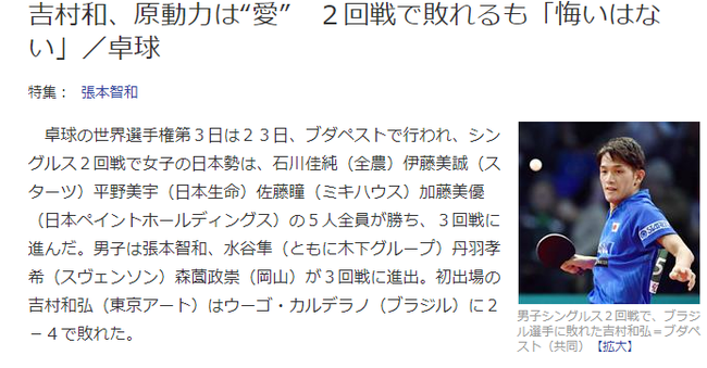 这一次,吉村和弘是“名正言顺”地通过选拔赛入围的世乒赛大名单。戏剧性的是,作为混双卫冕冠军的哥哥吉村真晴却落选了。后来由于石川佳纯的搭档张本智和右手无名指受伤,他这才临危受命,踏上了前往布达佩斯的末班车。