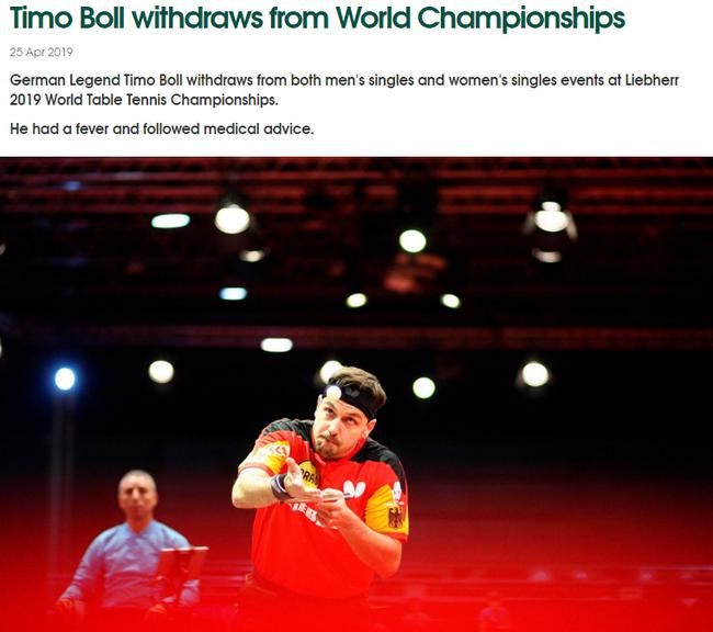 该文章第一段,国际乒联写到“德国传奇球员波尔同时退出男单和女单的比赛”……理由是波尔在发烧,遵照医生的建议选择了退赛。女单?好吧,其实波尔老师退出的是男双。