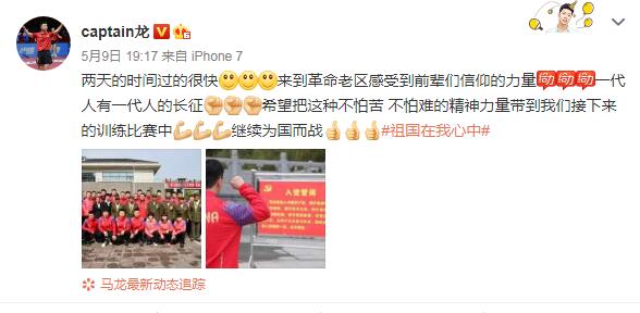 马龙:两天的时间过的很快[微笑][微笑][微笑]来到革命老区感受到前辈们信仰的力量[给力][给力][给力]一代人有一代人的长征[拳头][拳头][拳头]希望把这种不怕苦 不怕难的精神力量带到我们接下来的训练比赛中[加油][加油][加油]继续为国而战
