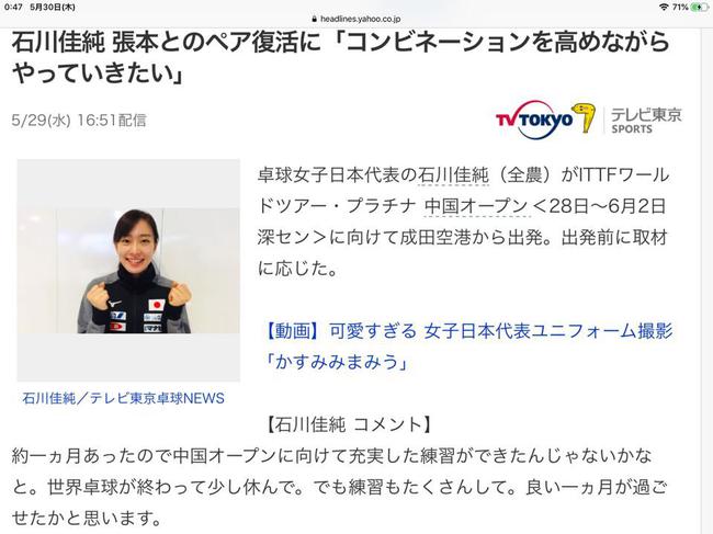 北京时间5月30日,为参加28日开幕的中国公开赛,日本乒球名将石川佳纯日前从成田机场出发,在出发前接受了媒体的采访,表示这次和华裔少年张本智和再度搭档混双心情既紧张又期待:“希望可以配合得更加默契,在比赛中发挥出好的水准。”