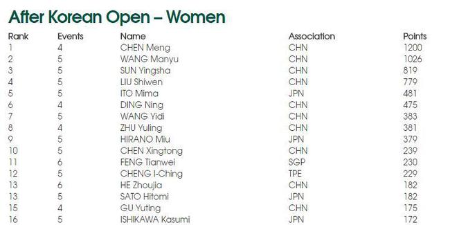女单项目中,前十除了日本选手伊藤美诚排在第五位,和排名第九的平野美宇,其它全部是中国选手。陈梦,王曼昱、孙颖莎、刘诗雯排名前四。