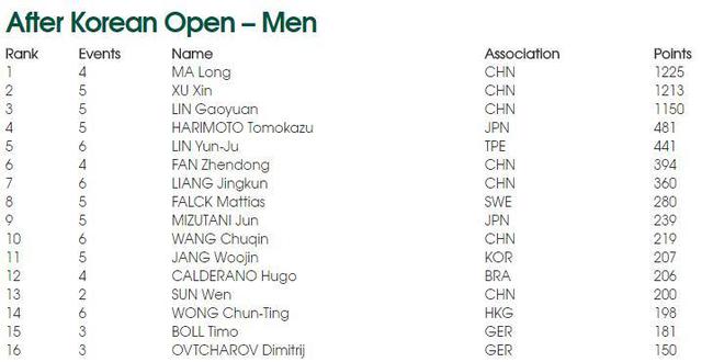 积分榜中男单项目的前三由马龙、许昕、林高远包揽。今年马龙在参加的四站巡回赛中有三项赛事打入决赛,卡塔尔站和中国赛均夺冠,日本赛止步八强,他以1225分排在第一。排名第二的许昕积分1213分,比马龙少12分。
