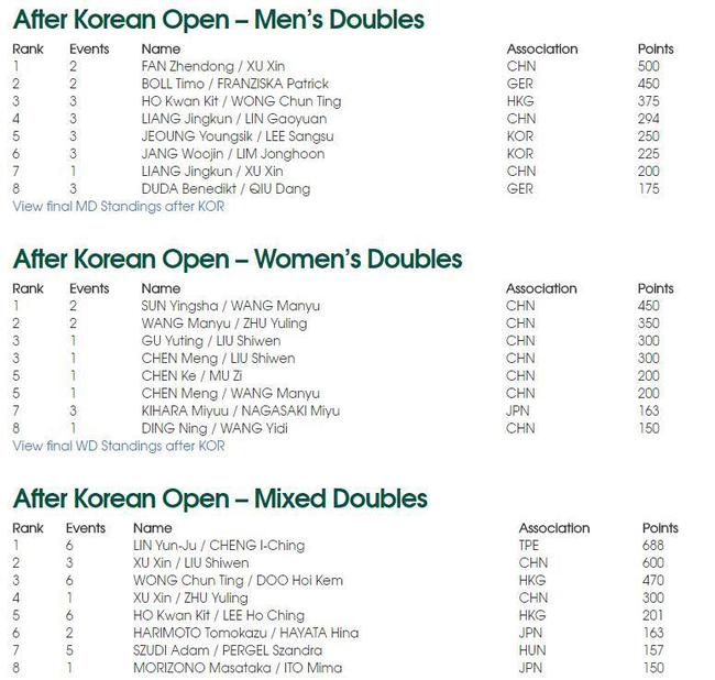 男双排名第一的是樊振东/许昕组合,女双前八名中七位都是中国组合,孙颖莎/王曼昱第一。混双方面,中国台北组合林昀儒/郑怡静排首位,许昕/刘诗雯以600分排在第二。