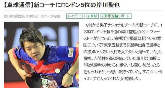北京时间8月20日,据日媒消息称,2012年伦敦奥运会第五、前日本男乒主力选手岸川圣也,将从8月份起获得日本男乒教练头衔。