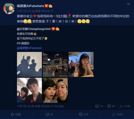 11月1日是福原爱31岁的生日,这一天,福原爱老公江宏杰不忘在微博上调侃一下爱酱,他写道“老婆生日快樂,這下我們年紀又不同了,永遠愛妳。”
