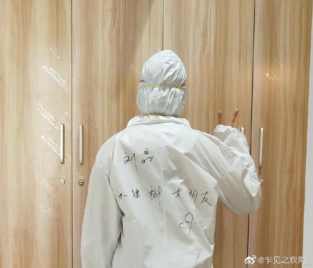 一位医护人员晒出一张身穿写有“张继科女朋友”字样防护服的照片,配文称:“嘻嘻嘻害羞写上了~病人都看到对我笑~永远爱科哥永远都是科哥女朋友。”张继科看到后转发回复:“欢迎你平安回家,我们都为你骄傲!”