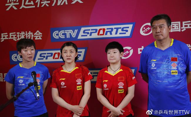 国乒奥运模拟赛团体赛,女一团3-0战胜女四团,晋级半决赛。赛后李隼指导和队员们接受了采访。