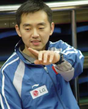 奥运乒乓球亚洲预选赛 孔令辉轻松观战   北京时间2004年4月9日,奥运会乒乓球亚洲预选赛继续在北京市海淀体育馆进行。图为王皓在比赛中,队友孔令辉等在一旁观战。