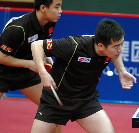 04年奥运乒球亚洲区预赛 孔令辉发球瞬间   2004年4月13日,中国男双选手王皓/孔令辉(右)在2004年奥运会乒乓球亚洲区预选赛中,以4比0战胜中国台北选手张雁书/吴志祺,获得奥运资格。