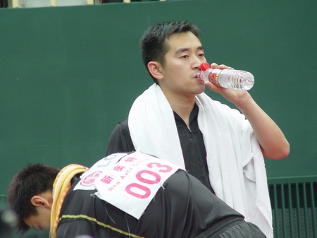奥运乒球双打预选赛 孔令辉赛前准备   北京时间2004年4月12日,奥运乒乓球亚洲预选赛双打比赛在北京海淀体育馆开赛,孔令辉/王皓在第二阶段比赛的首场比赛中4-2击败马琳/陈杞获得胜利。图为比赛中的精彩瞬间。